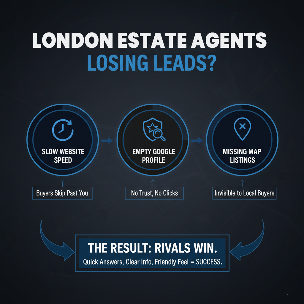 Agencies pack London. Big chains, small independents, hybrid online firms, and those flashy “no commission” brands. Everyone is fighting for attention, and the truth is simple. If your site loads slow, if your Google Profile looks bare, or if your listings do not show up on Maps, buyers skip past you. They want quick answers, clear info, and a friendly feel. When they can’t see it, they click away and go to your rivals.
