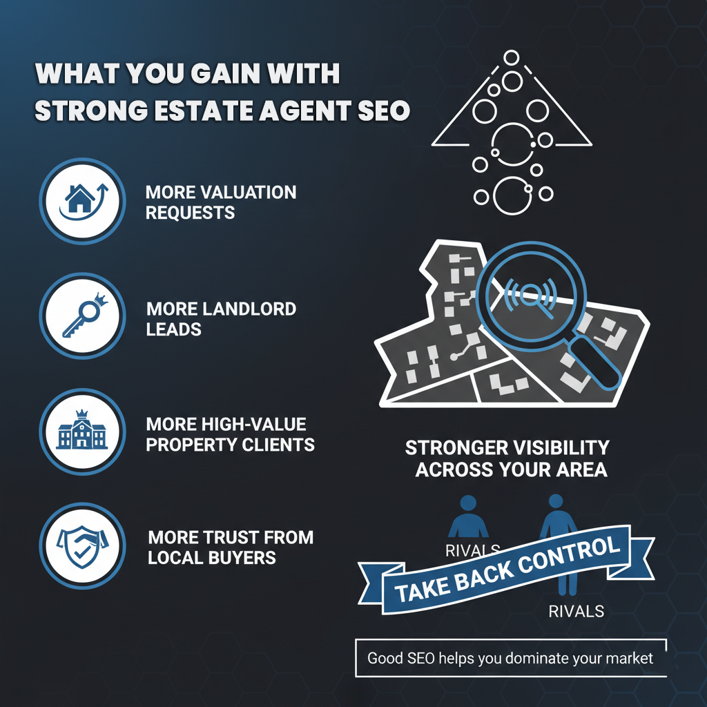 Most buyers start their property search online rather than going to a high street branch. They search for “estate agent near me” or “best agent in my area”. They look at reviews. They check photos. They look at your listings. If you’re not visible when they first start searching, you lose trust before you even speak to them. Strong SEO helps you stand out. It builds your authority and makes you the safe choice before the first phone call.