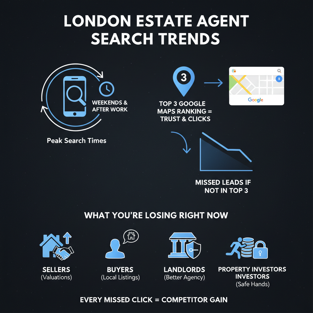 In London, searches for estate agents rise on weekends and after work. Buyers often browse listings on their phones during these times. Most people tap the top three results on Google Maps because it feels close and trusted. Competitors know this, so they push hard to stay in those spots. If your agency is not in that group, the chances of getting the lead drop quickly. This is the real behaviour we see each month in the London market.