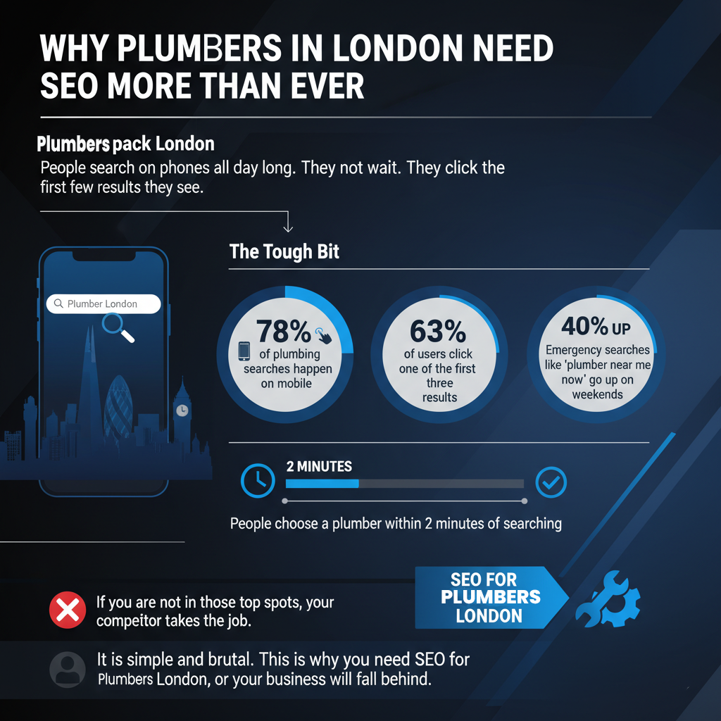 There are many plumbers in London. The market is crowded and competitive. People search on phones all day long. They do not wait. They click the first few results they see. Here is the tough bit.
