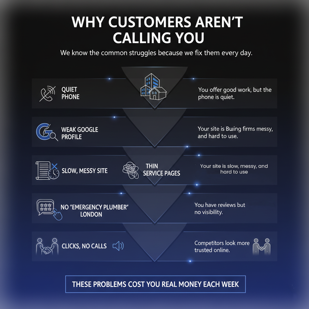 You work hard every day. You fix leaks, sort boilers, and help people when they feel stressed. In London, many plumbers have trouble getting noticed online, so their phones stay quiet. It hurts because you know you are good at your job, but bigger firms keep showing up first. Without a Google presence, people forget you exist. That is how London works.