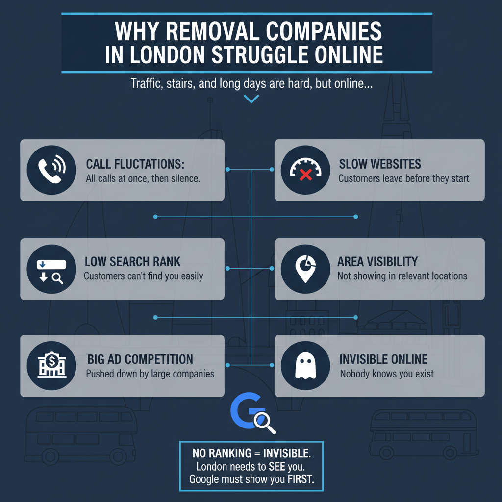 Running a removal business in London is tough. You deal with traffic, tight roads, stairs, last-minute bookings, and long days. But online? It gets even trickier.