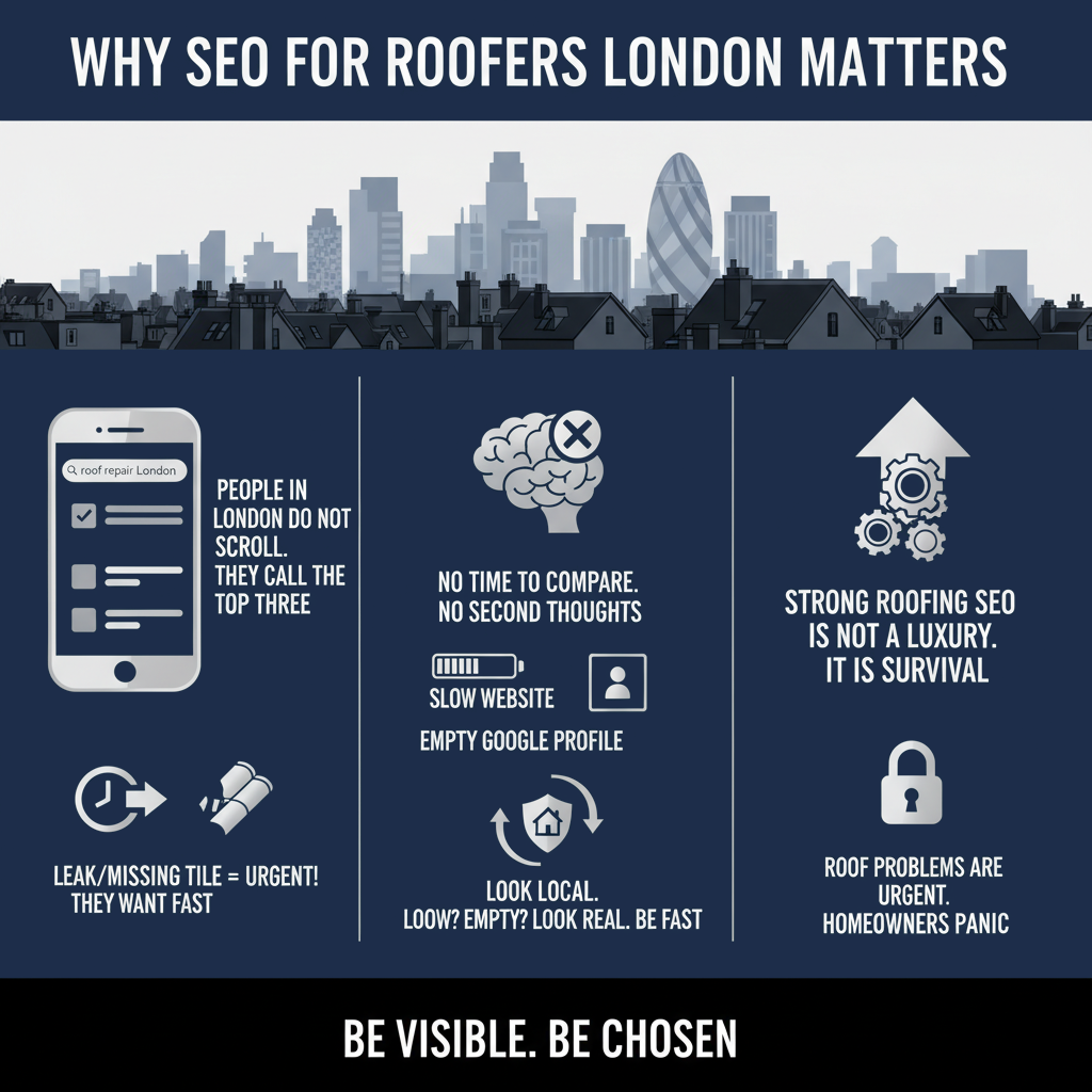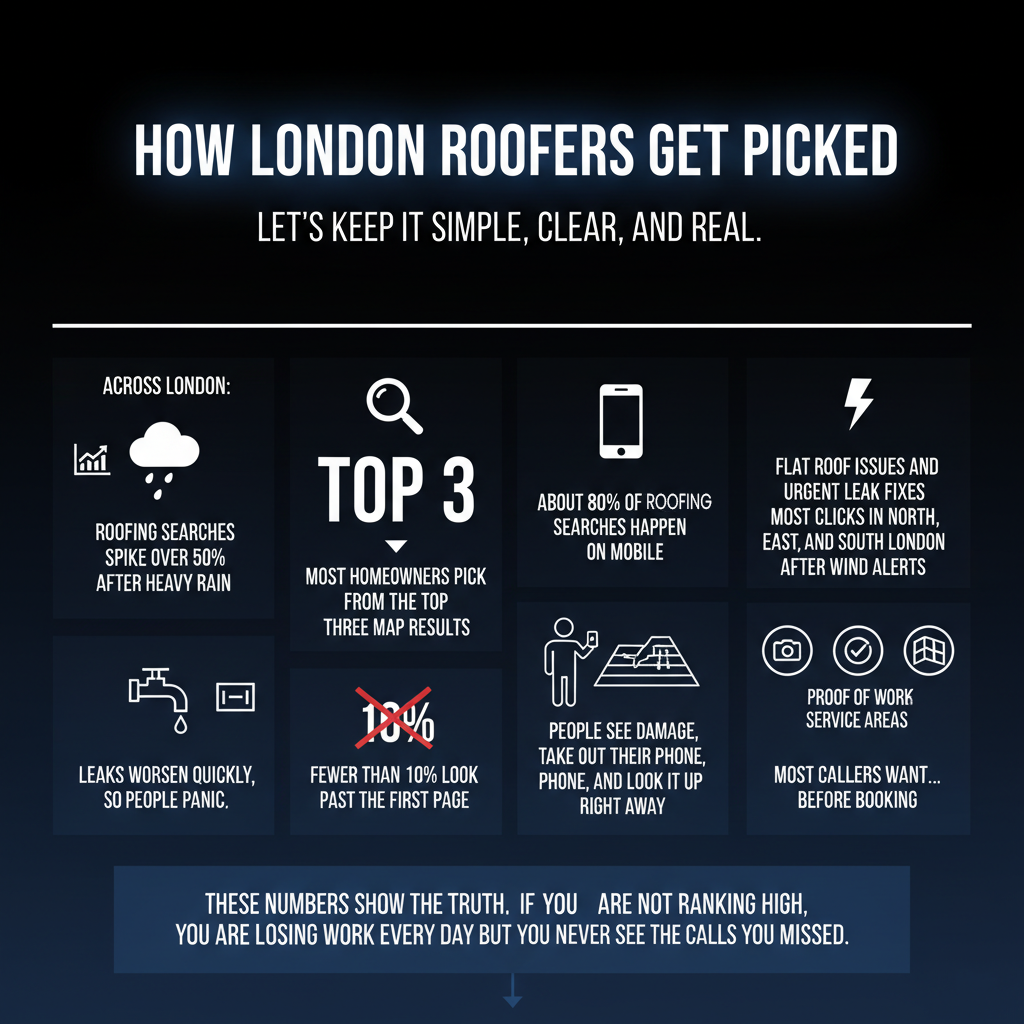 People in London do not scroll. They do not compare. They do not think twice when there is a leak in the ceiling or a missing tile after heavy wind. They grab their phone, type in “roof repair London”, and call whoever shows up in the top three. If your website loads slow or your Google Business Profile looks empty, they move on. They want a roofer who looks local, real, and able to come fast.