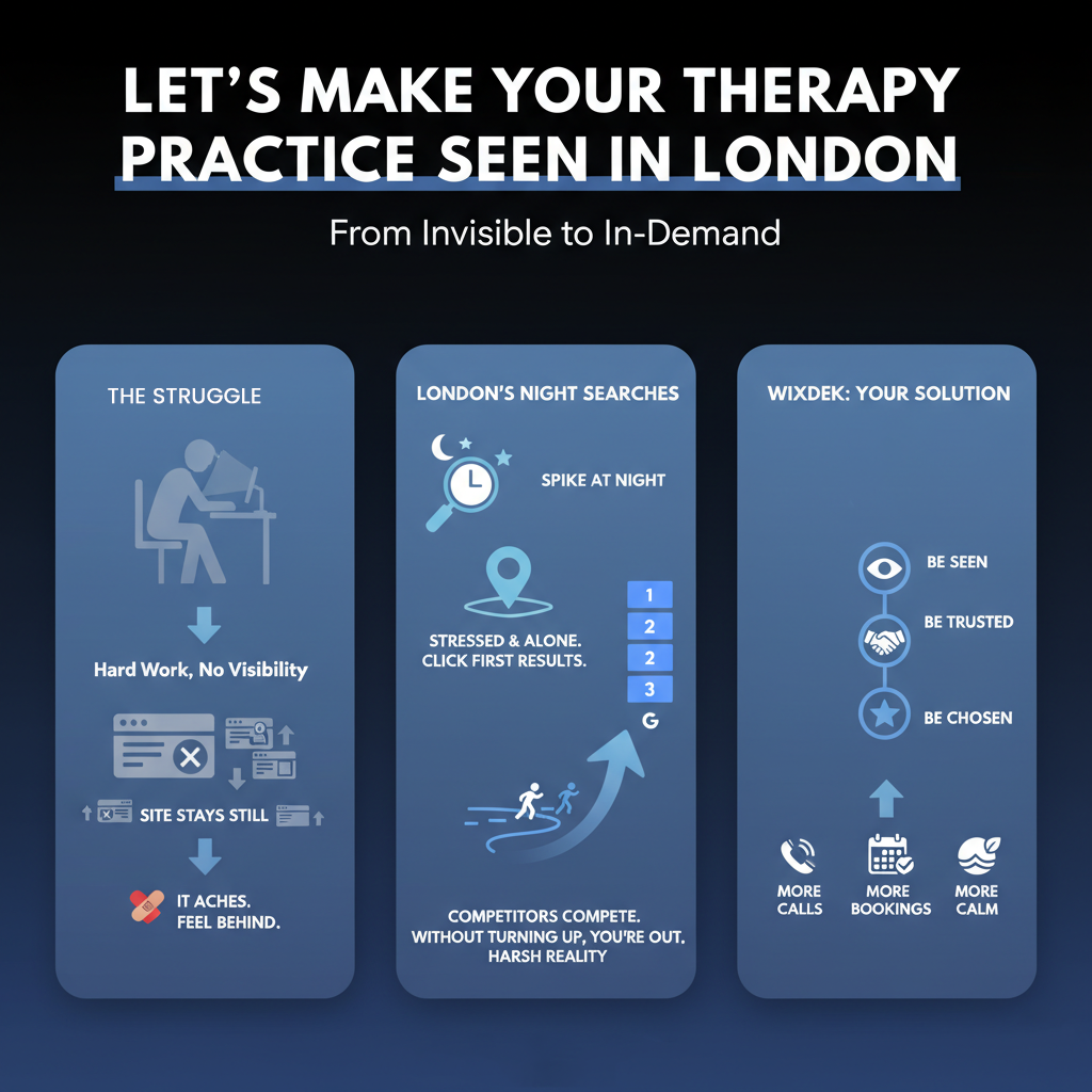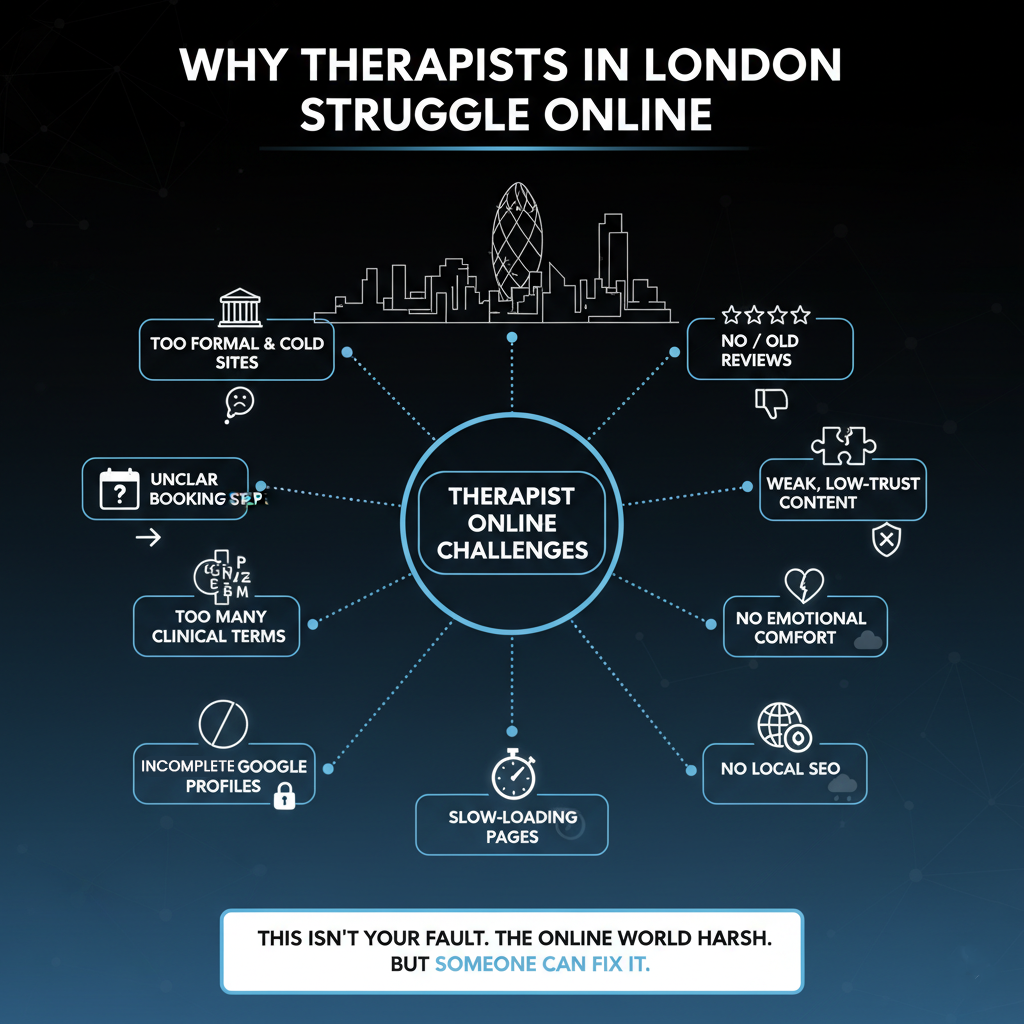 Most therapists in London work so hard to help people, but online it feels like no one sees them. You might try hard in every session, but your site stays still while your competitors grab the clicks. It aches. Even with your greatest efforts, you feel behind.