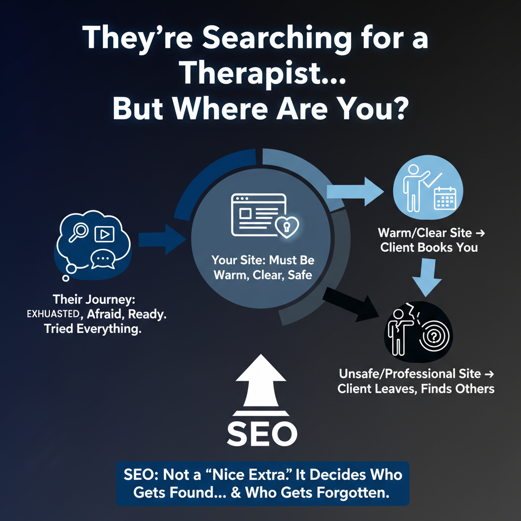 When someone starts looking for a therapist online, it’s never their first step. They’ve tried everything on their own. After reading postings, watching videos, asking friends, and sitting with their worry for weeks, they felt lost. They look for a therapist exhausted, afraid, and ready for help. That’s your client. But if your site doesn’t look warm, clear, and safe, they leave in seconds and book someone else. You never see that client, but you feel the loss. This is why good SEO matters. If you appear untrustworthy or unprofessional, clients will pick another therapist they find first. SEO is not a “nice extra” for therapists. It decides who gets found… and who gets forgotten.