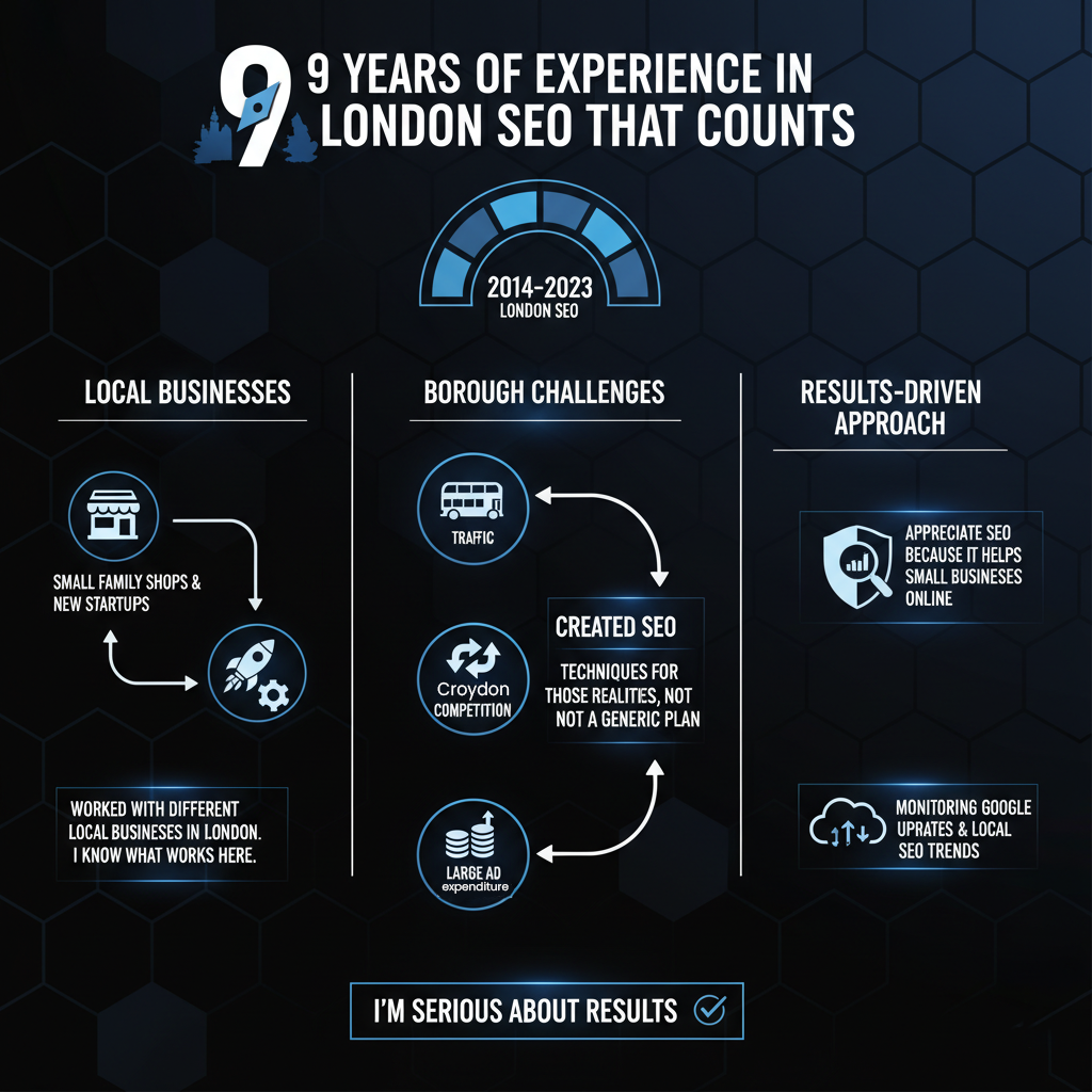 I’ve worked with different local businesses in London. From small family shops to new startups. I know what works here. Each borough faces its own challenges. Camden traffic, Croydon competition, Hackney large ad expenditure. I created SEO techniques for those realities, not a generic plan.