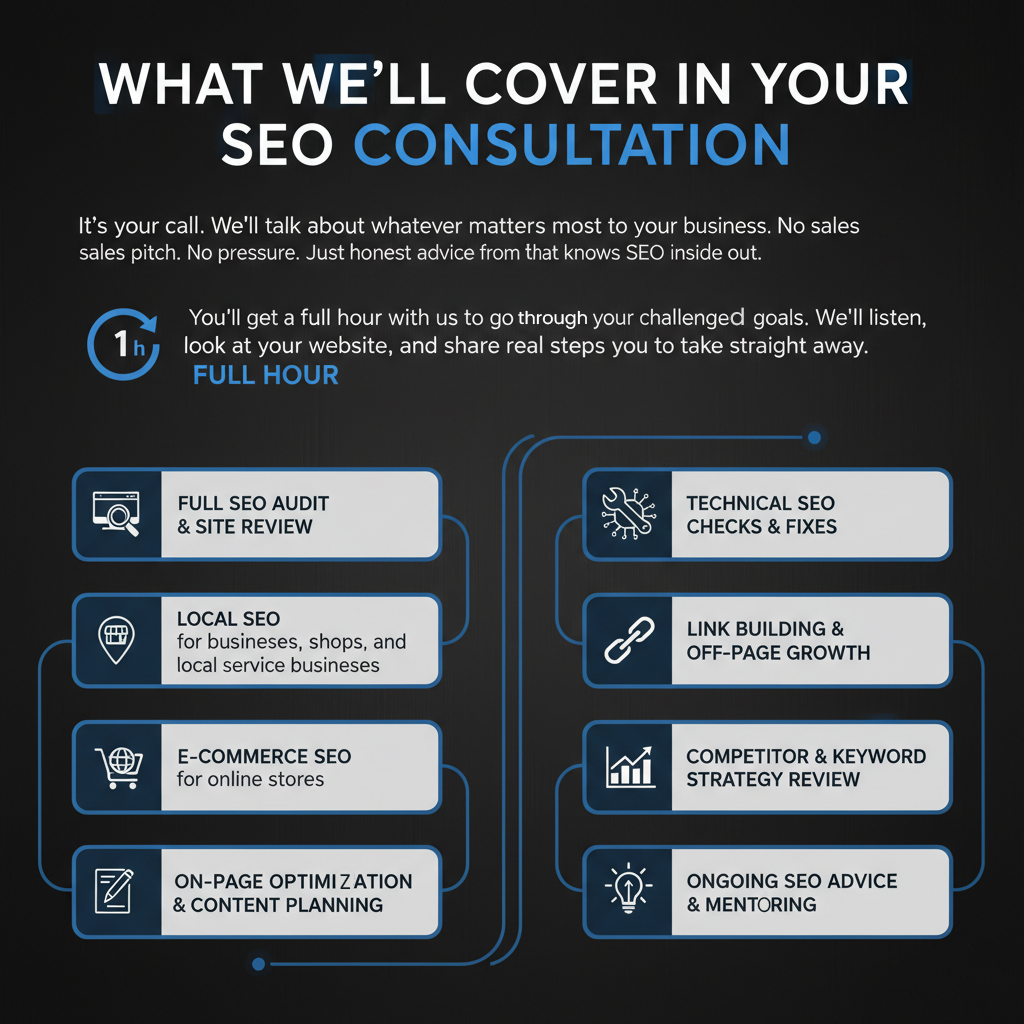 You’ll get a full hour with us to go through your challenges and goals. We’ll listen, look at your website, and share real steps you can take straight away.