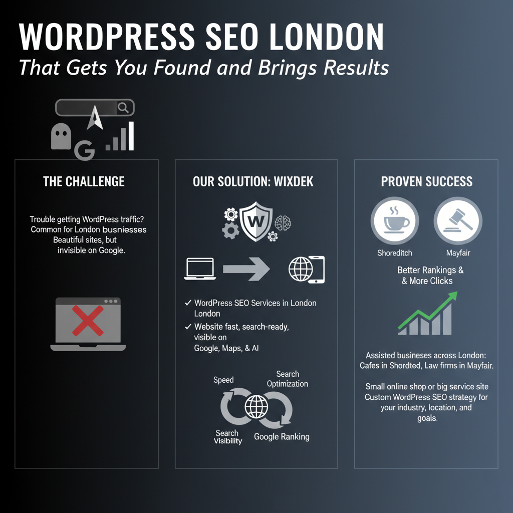 Trouble getting WordPress traffic? Your situation is common. Many London businesses spend money on beautiful sites, but they never show up on Google. That’s where we step in. At Wixdek, we help local businesses fix that. We provide WordPress SEO services in London. Our services make your website fast, ready for search, and visible on Google, Maps, and AI results.